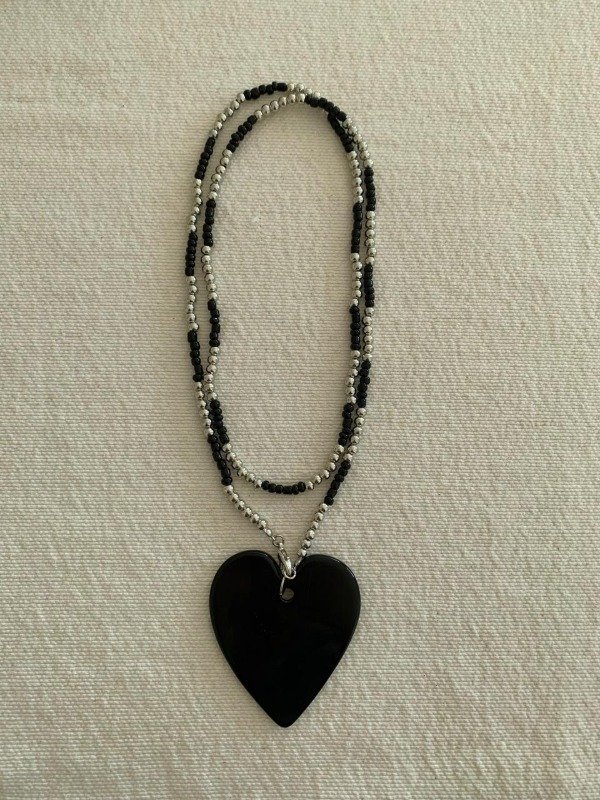Collar hecho a mano con mostacillas negras y bolitas de metal plateadas, de 88 cm y dije desmontable de corazón de resina negro, para usar simple y largo, doble regulable, con o sin dije.
