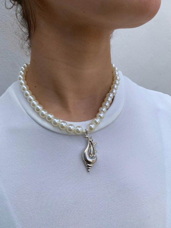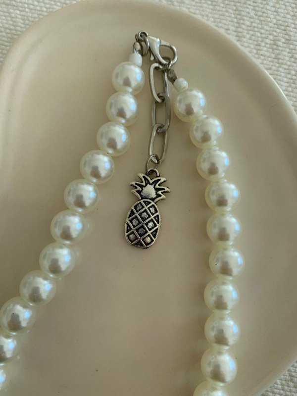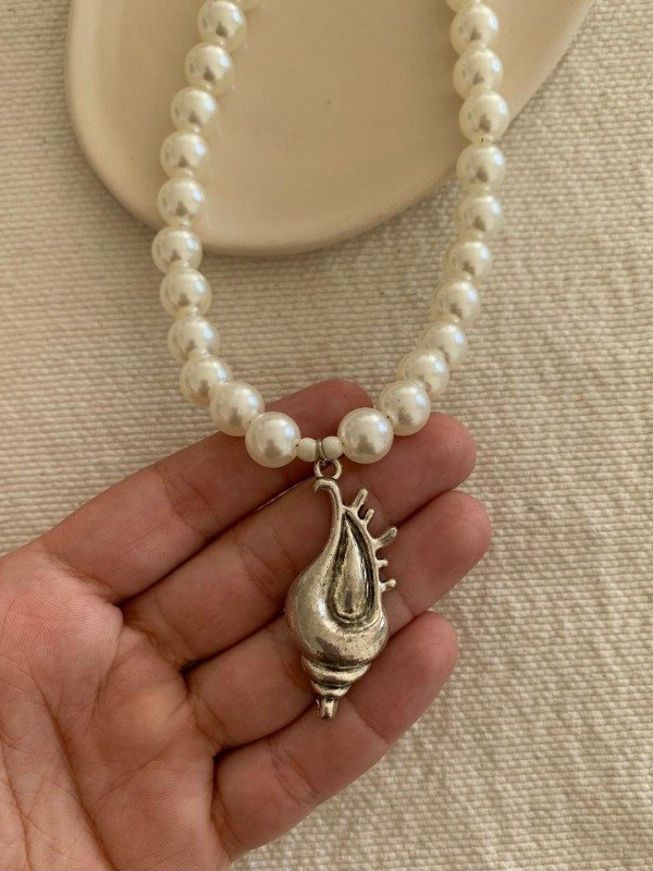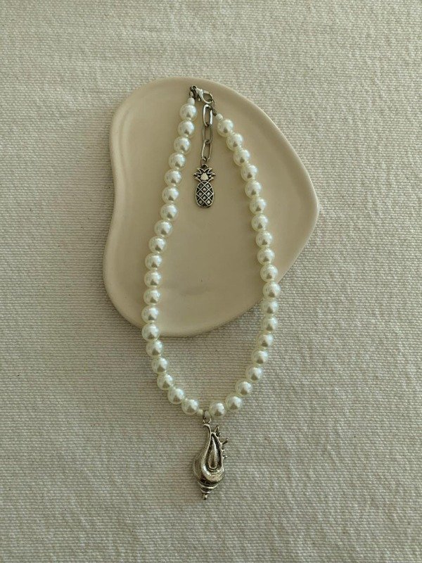 Collar hecho con perlas plásticas color crema y dije de caracol de metal de 38 cm + 3 cm de extensión y dije terminal de ananá