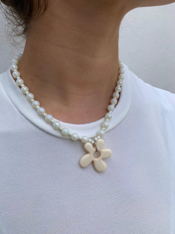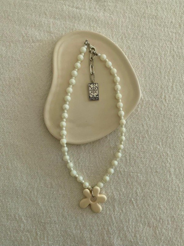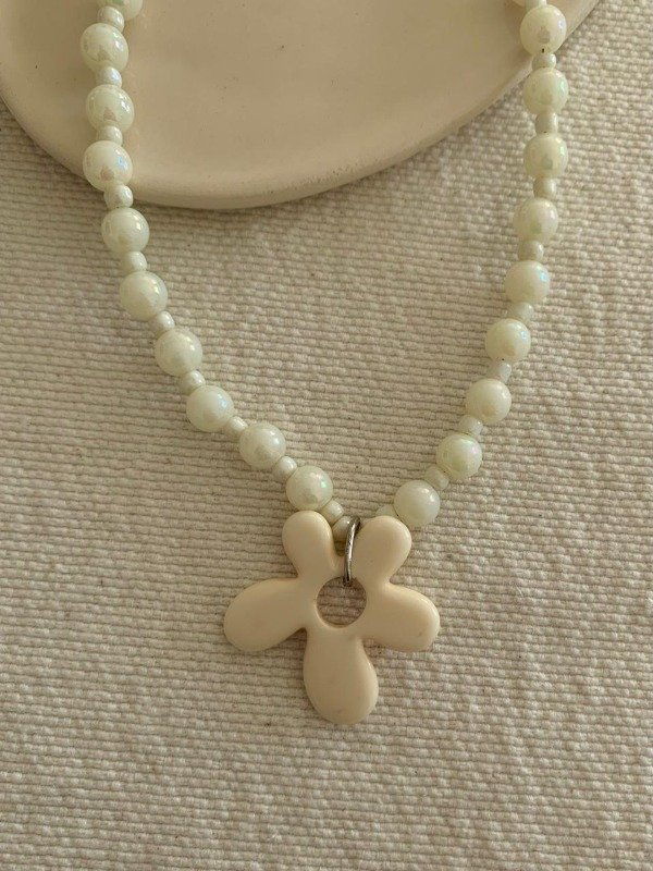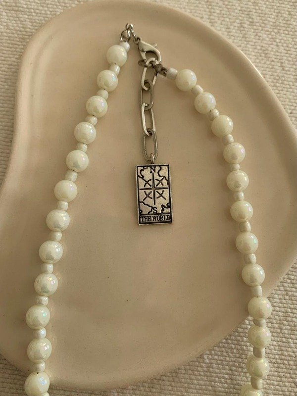 Collar hecho a mano con perlas, mostacillas y dije de margarita de resina, de 40 cm de largo + 4 cm de extensión y dije terminal de tarot