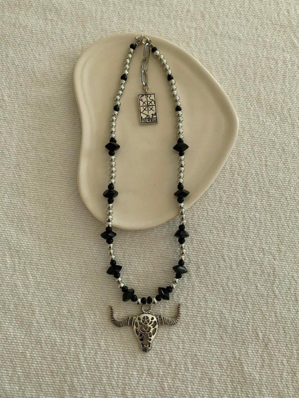 Collar hecho a mano con piedras acrílicas, mostacillones, bolitas de metal y dije de toro de 40 cm + 3 cm de extensión y dije tarot terminal